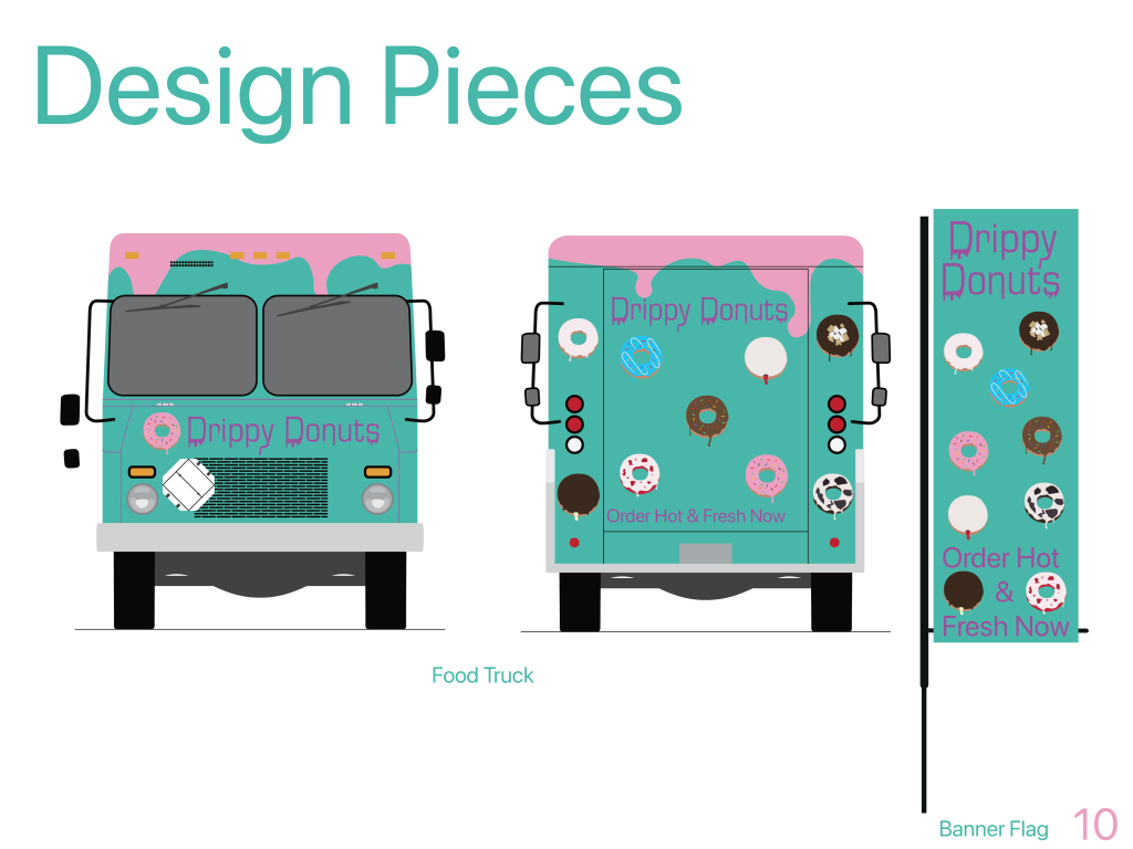 Who can resist a hot, delicious donut? Drippy Donuts is a fictional food truck concept dedicated to bringing smiles and sugary satisfaction to the streets. This project focused on creating a mouthwatering brand identity that captures the essence of fresh, delicious donuts. The centerpiece is a playful logo featuring a dripping donut covered in sprinkles. This logo takes center stage on the vibrant truck wrap, which is adorned with whimsical donut illustrations and a color scheme that evokes sweetness and joy. Menu boards utilize clear visuals and playful descriptions to entice customers, while custom packaging ensures the Drippy Donuts experience continues even after the purchase. This project demonstrates the power of design in creating a memorable and visually appealing brand identity for a mobile food vendor.