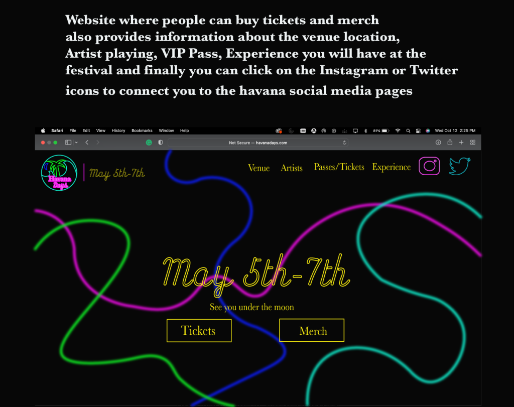 Havana Days is a fictional R&B festival where smooth sounds meet a neon paradise. This project focused on crafting a brand identity that captures the sophisticated yet inviting atmosphere of the event. The design fuses the soulful energy of R&B music with the electric vibrancy of neon colors. The centerpiece of the brand identity is a neon palm tree logo, its vibrant glow symbolizing the laid-back island vibes that perfectly complement the soulful sounds of R&B. This neon aesthetic bleeds across all branded materials – from flyers and posters to social media graphics bursting with animated neon elements and R&B iconography that echo the palm tree logo. Merchandise like t-shirts and glowsticks are designed to be seen and celebrate the festival’s unique fusion of music and neon vibes. Havana Days’ brand identity is a testament to the power of visual design to elevate the experience and make it truly unforgettable for R&B fans.
